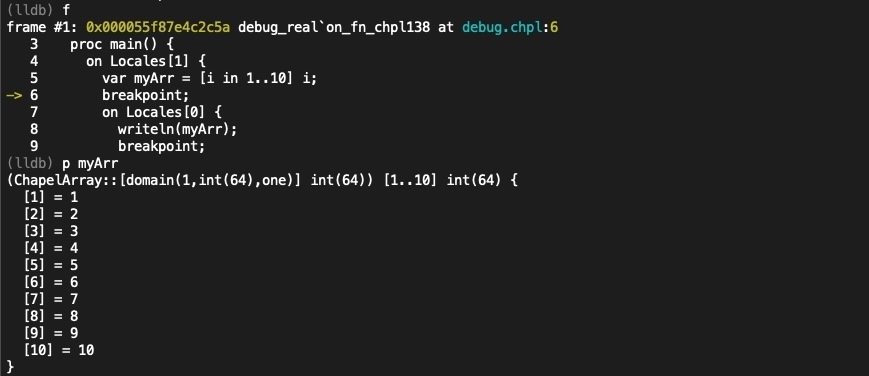 This release adds support for Chapel’s [note:In Chapel, if a variable is visible within a given scope, it is available for use by the programmer even if it is stored on a remote locale.] to the debugger. This means that while debugging a particular locale, values stored on another locale can be inspected. Combined with the ability to pretty-print Chapel types, as introduced in the last release, debugging Chapel programs has never been easier.