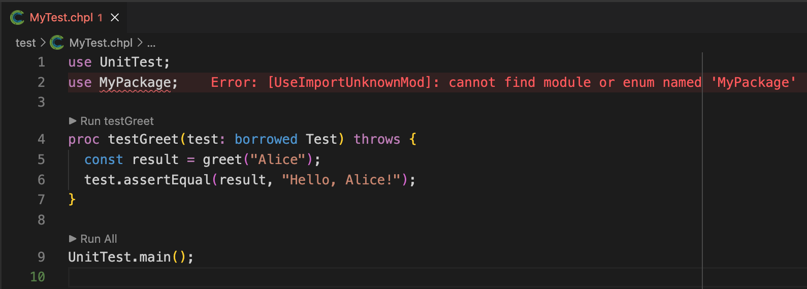 Chapel 2.7 includes a slew of improvements to Mason, Chapel’s package manager. The first highlight is better integration with Chapel’s ever-growing tooling support. In Chapel 2.6, VSCode users had to take additional steps to configure the language server so that it could recognize a Mason package’s structure. Without that additional step, users would get errors about the Chapel compiler not being able to find a module included in the Mason package, like the following::