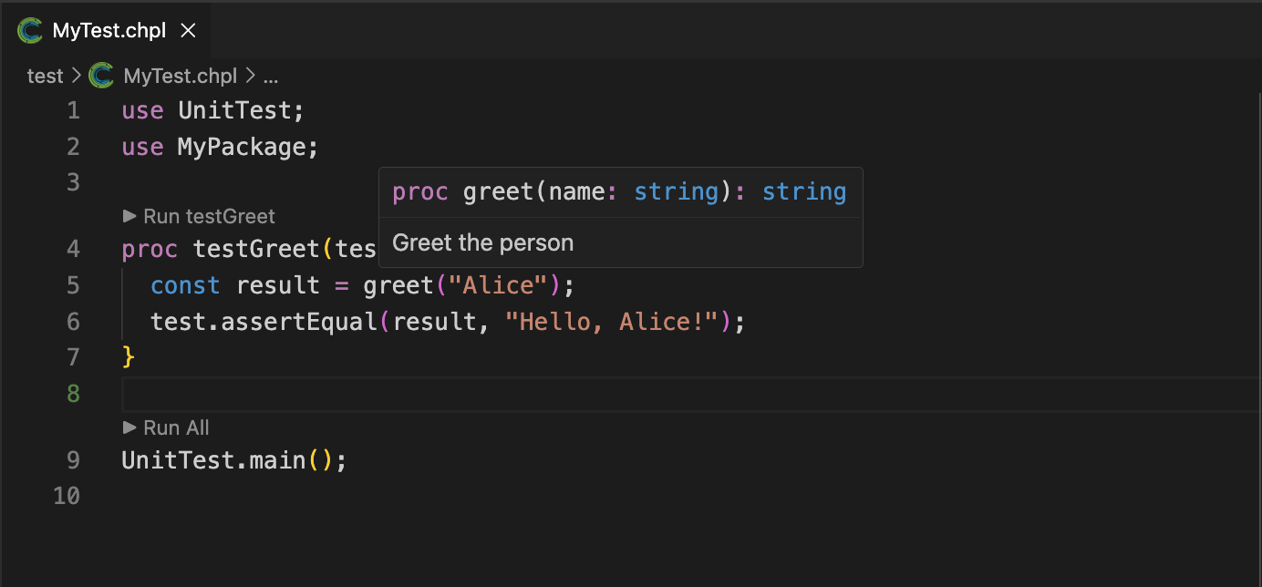 Our team has been hard at work implementing many features of Chapel’s type system in Dyno, which, among other things, will enable tools like CLS to provide more accurate and helpful information to users. In the 2.7 release, we have continued to improve Dyno’s support for Chapel’s language features, and we’ve also expanded the compiler’s ability to leverage the Dyno front-end to generate executable code.